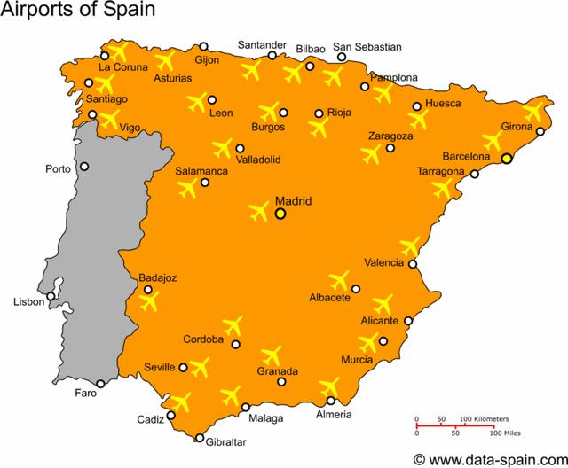 L'aeroporto di Alicante-Elche, originariamente conosciuto come El Altet, è il quinto aeroporto più trafficato del paese in termini di traffico passeggeri che serve la zona della comunità valenciana e la regione di Murcia. Si trova a Elche, 10 km a est della città e 9 km a sud-ovest di Alicante, come mostrato nella mappa degli aeroporti della Spagna. L'aeroporto è una base per Air Nostrum, Evelop Airlines, Norwegian Air Shuttle, Ryanair e Vueling. L'aeroporto di Gran Canaria, a volte indicato come l'aeroporto di Gando, è il sesto aeroporto più trafficato del paese in termini di traffico passeggeri. Si trova a 19 km a sud del centro di Las Palmas de Gran Canaria e a 25 km dalle famose località e zone turistiche del sud. L'aeroporto di Tenerife Sur, prima conosciuto come South-Reina Sofia, è il più grande dei due aeroporti internazionali che servono l'isola di Tenerife e il secondo aeroporto più trafficato delle Isole Canarie.
